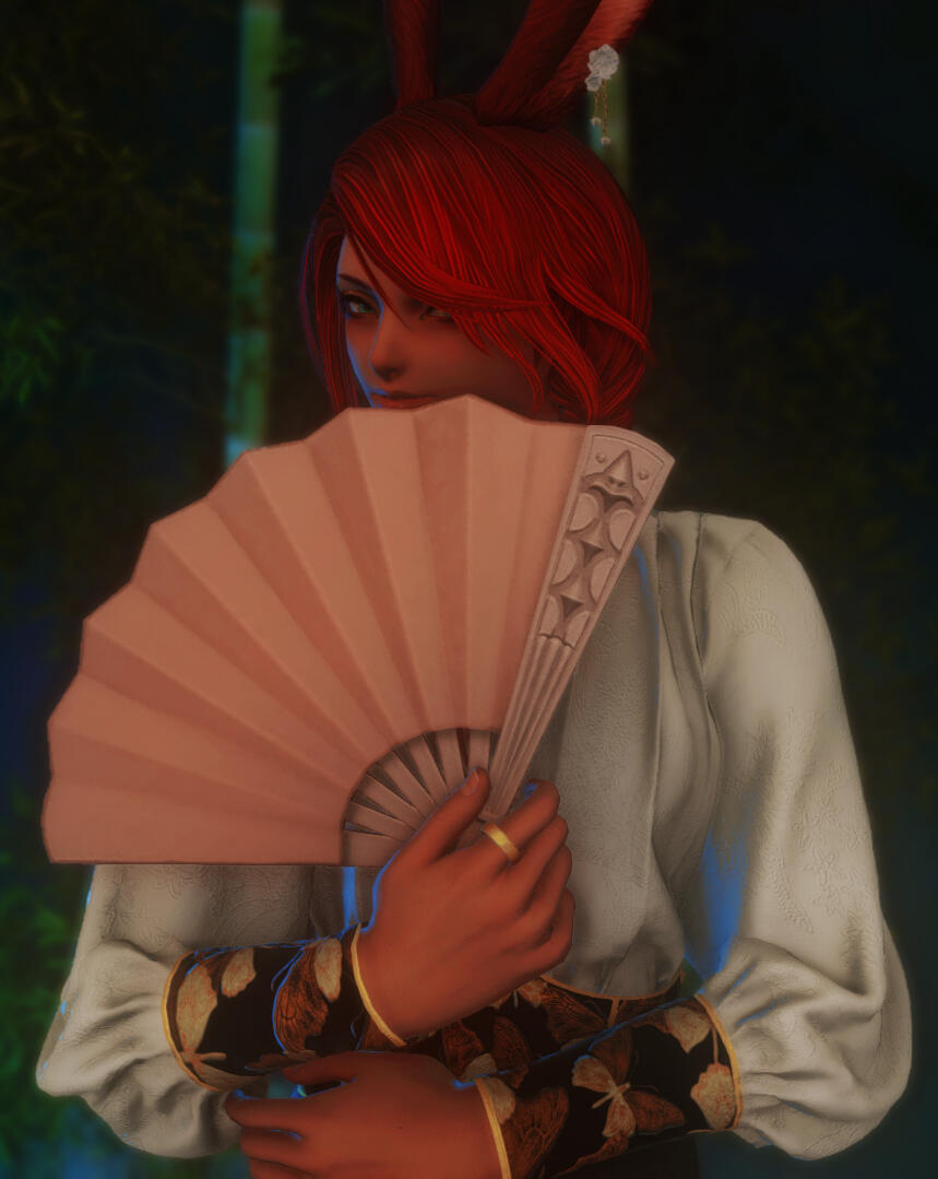 Ari was born and raised on the cold peaks of the Skatay Ridge. When the men of his village came for him, he left without fuss. He was eager to please his new family and went about his training and chores without complaint. It wasn't until he came to understand his future of solitude that he grew dissatisfied.When he stumbled out of his forest he realized the weight of his actions. He had no direction and more importantly, no one to rely on. His mentor had told him to follow a particular star as it danced across the sky. For days he traveled in the evenings, following the direction of the star in hope he would find a city or at least someone.Just as he began to lose hope, he heard the laughter of people and the sounds of music. A traveling band of performers were making their way down the dirt road to their next town. They found his exotic beauty enchanting and were quick to allow him to travel with them. They taught them their songs and dances and he was quick to pick on them with his natural grace. For many months he traveled with them and learned the customs of those outside the forest.When they reached Shirogane he fell in love with the city and left the group. It was easy for him to find work in the many teahouses as a server before becoming a courtesan. His days are no longer spent alone, but he feels more empty than he ever did in the forest.It didn't take long for the naive viera to fall in love with one of his clients. The feeling was not mutual and though he was denied, Ari took it with grace. These days his smiles are just a little more shallow, his eyes a little more empty.